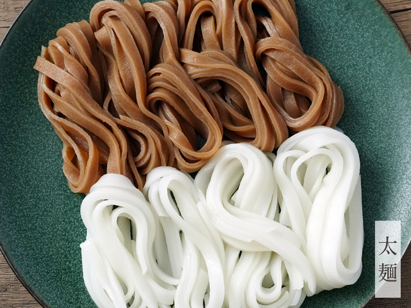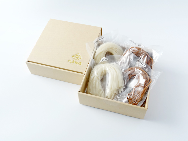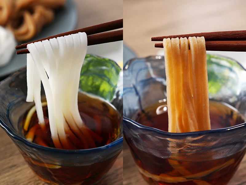 セットには、白米麺(中太・太麺)と玄米麺(中太・太麺)が各1個ずつ入っており、麺の種類ごとの食感や風味の違いを食べ比べでお楽しみいただけます。