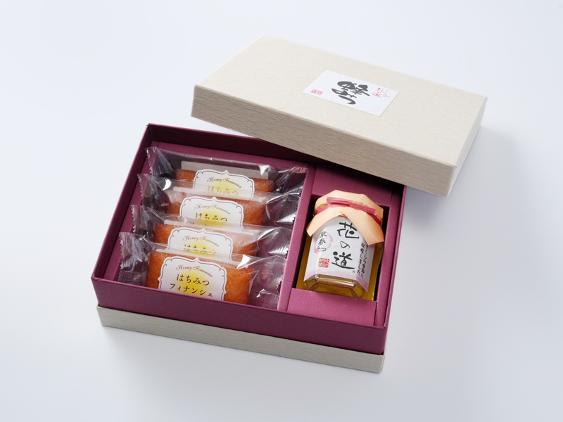 自然の花々から採れた国産蜂蜜「花の道」と、しっとりと焼き上げたフィナンシェを詰め合わせたギフトセットです。